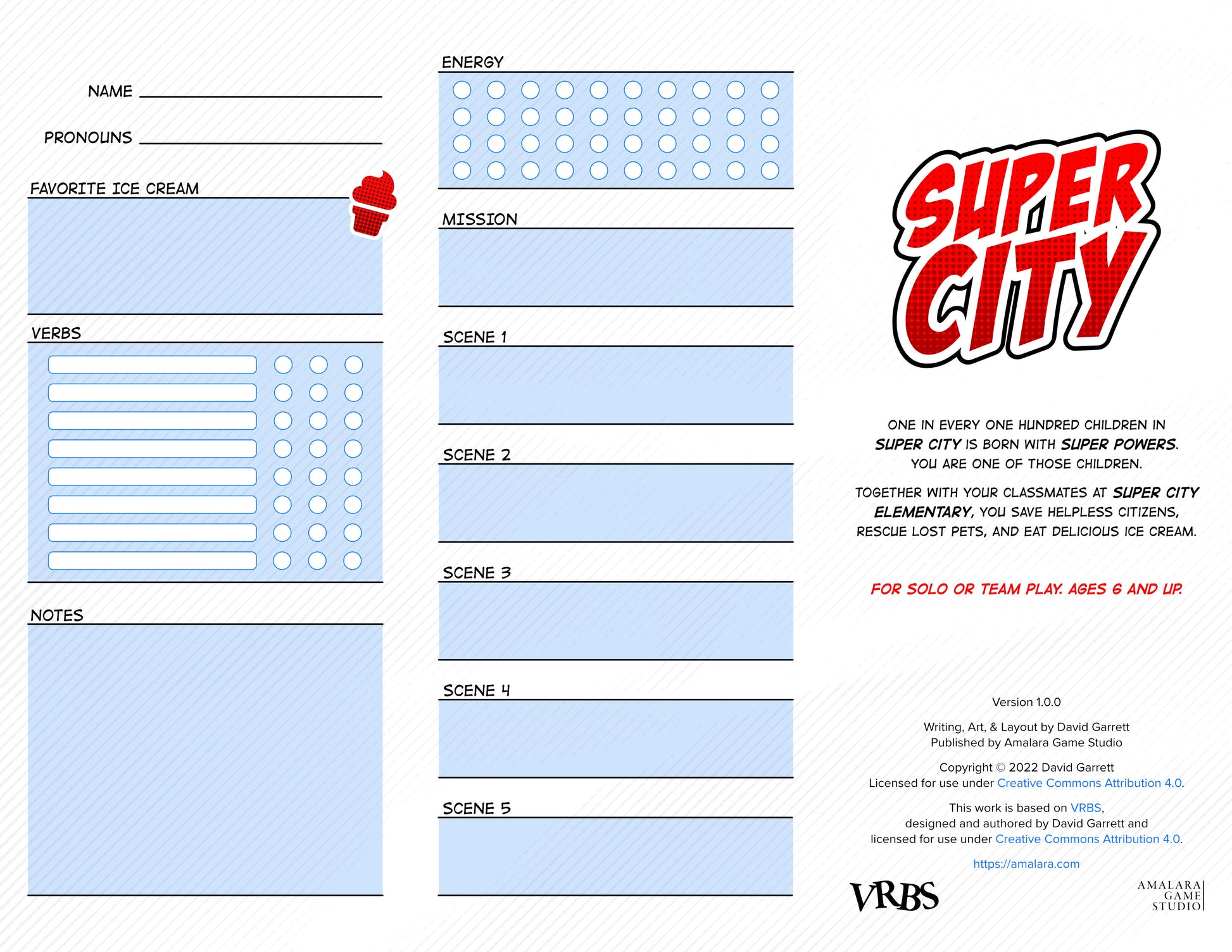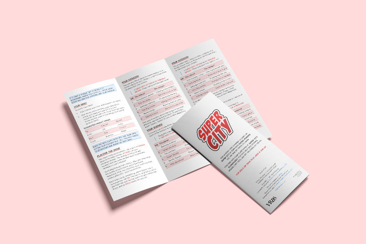 Utilizing the ultralight VRBS system, Super City is easy enough for a six year-old to master, but also provides the structure for anyone to generate a superhero story of their own.
