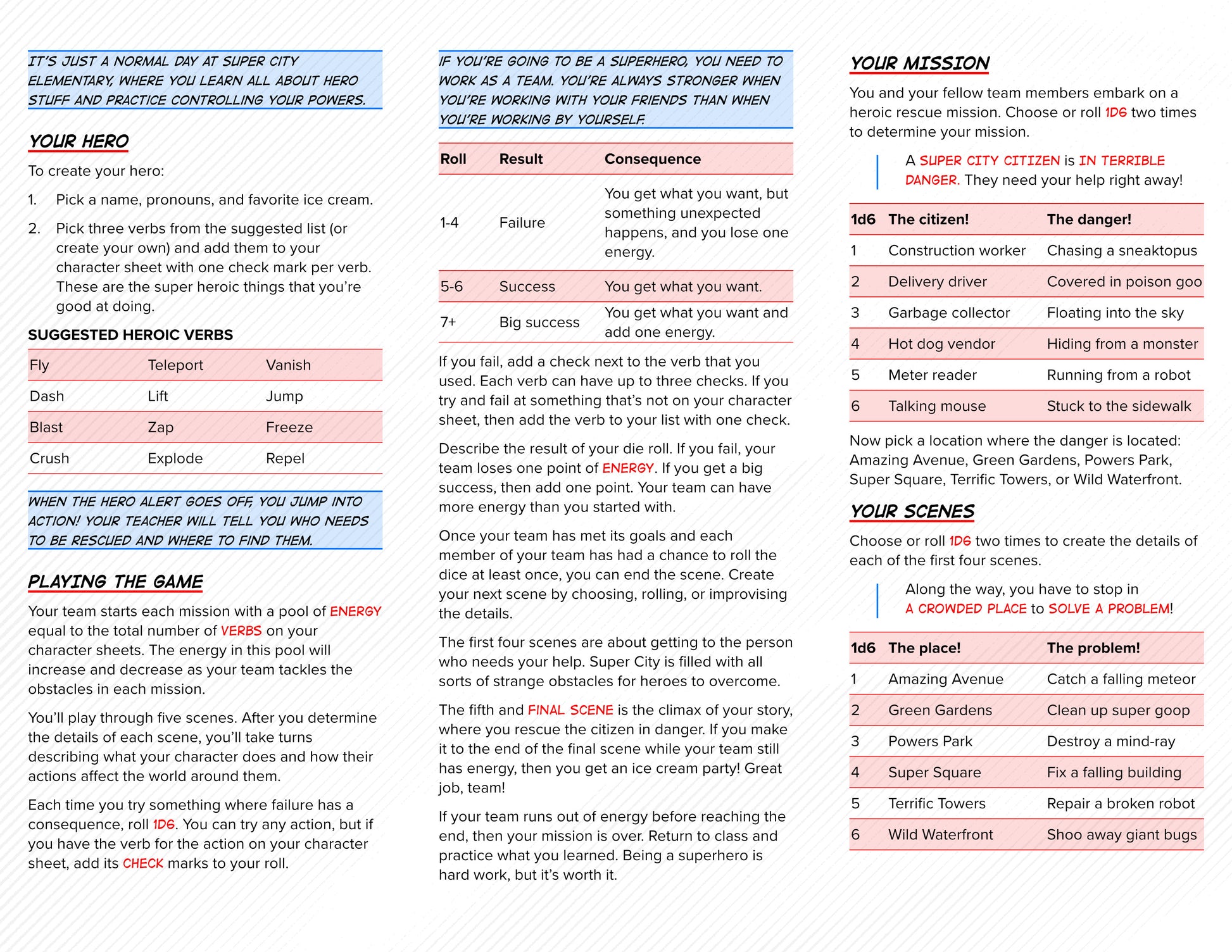 This role-playing game of superhero school kids contains all the rules that you need to play. You'll provide: